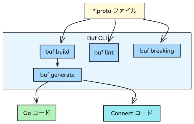 | buf generate | buf.gen.yaml で protoc プラグインを一元管理し、Go / Connect コードを生成 |